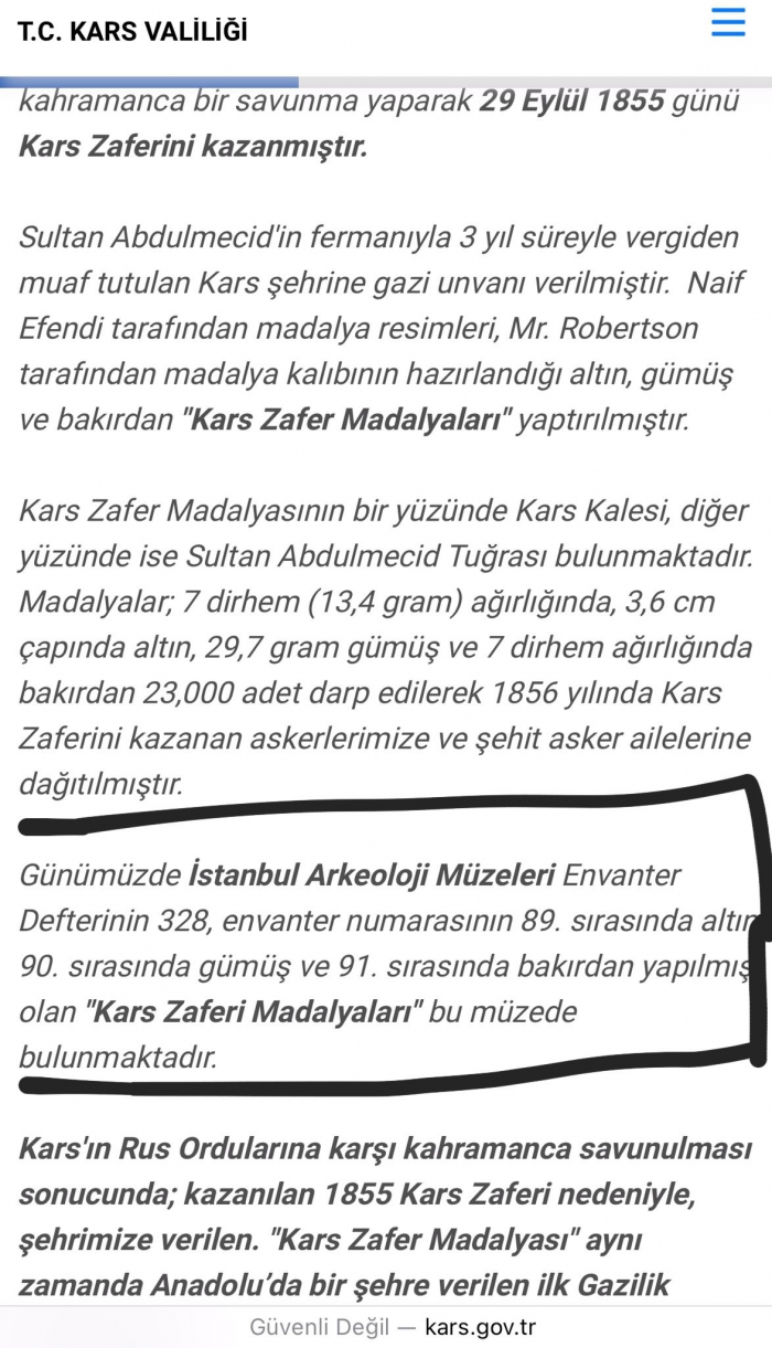 KARS VALİLİĞİNİN RESMİ İNTERNET SİTESİNDE MADALYALARIN İSTANBUL'da OLDUĞUNU TESCİLLİYOR: