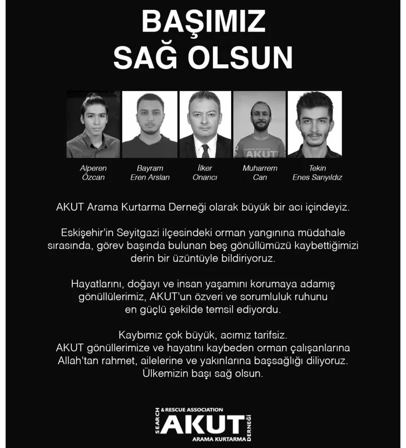 Eskişehir Seyitgazi'de çıkan orman yangınına müdahale ederken insanlık, doğa ve tüm canlılar için gözünü kırpmadan ve hiçbir karşılık beklemeden harekete geçen onurlu, fedakar, yürekli, vicdanlı ve cesur 5 kahraman AKUT gönüllüsünü kaybetmenin derin acısı hâlâ yaşanıyor. "Aziz şehitlerimiz; Muharrem Can, İlker Onarıcı, Tekin Enes Sarıyıldız, Bayram Eren Arslan, Alperen Özcan kahramanca ülkemizin ormanlarını, yeşil vatanı korumak uğruna en yüce bedeli ödeyerek aramızdan ayrıldılar. Her biri AKUT ailesinin çok değerli birer üyesi ve bu toprağın gerçek kahramanlarıydılar. Başta kıymetli aileleri olmak üzere, tüm sevenlerine ve AKUT camiasına başsağlığı ve sabır diliyoruz" .