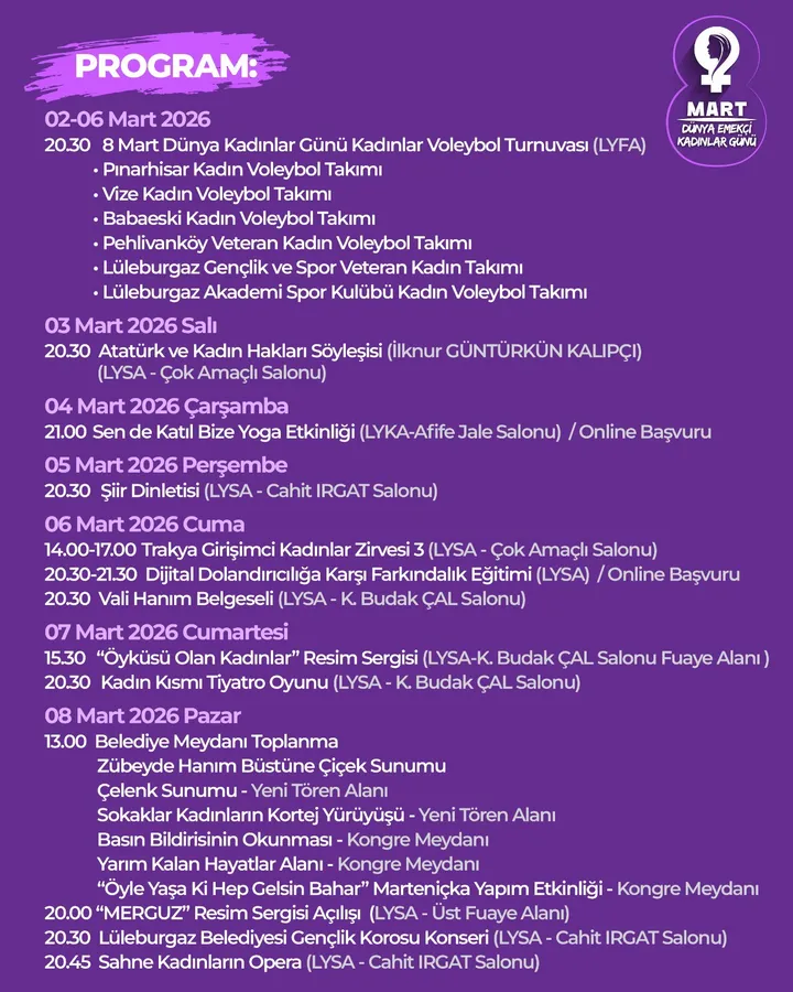 Lüleburgaz Belediyesi tarafından yapılan açıklamada, tüm basın emekçileri ve halk davet edilirken, kadınların hak arama mücadelesinin simgesi olan bu anlamlı haftada toplumsal farkındalığın artırılmasının hedeflendiği belirtildi.