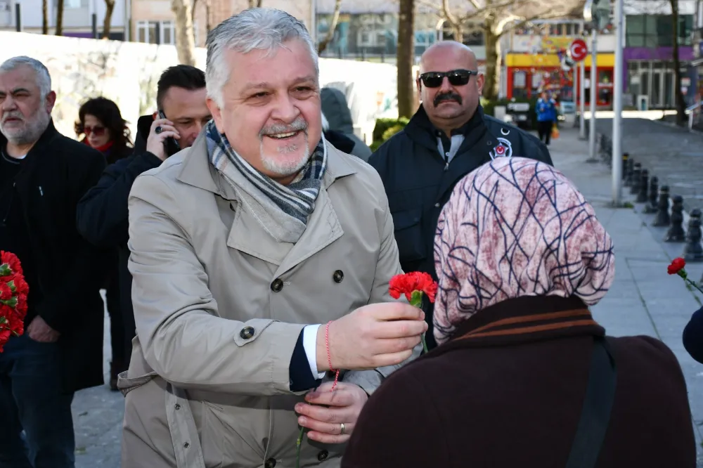 Gerenli yürüyüş öncesinde meydana toplanan kadınlara karanfil verdi.