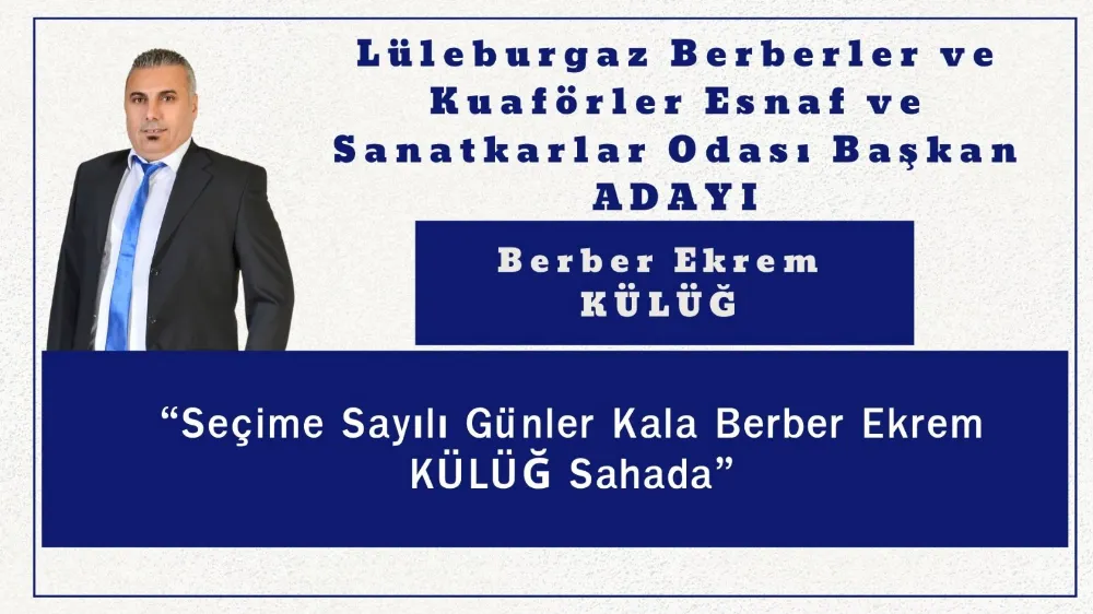 Lüleburgaz Berberler ve Kuaförler Esnaf ve Sanatkarlar Odasi Baskanligi için 18 Ocak’ta yapilacak seçimler öncesinde adayligini açiklayan berber Ekrem Kulug, “Bu Oda Hepimizin” sloganiyla seffaf, katilimci ve yenilikçi bir yönetim anlayisini kamuoyuyla paylasti.