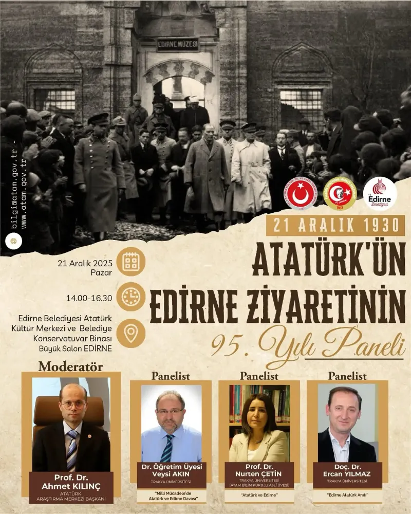 Cumhuriyetimizin kurucusu Gazi Mustafa Kemal Atatürk’ün Edirne’ye teşriflerinin 95. yılı, şehirde düzenlenecek bir dizi etkinlikle kutlanacak. Kutlamaların en önemli ayağını, 21 Aralık 2025 Pazar günü saat 14.00’te Edirne Belediyesi Atatürk Kültür Merkezi’nde gerçekleştirilecek olan kapsamlı panel oluşturuyor.